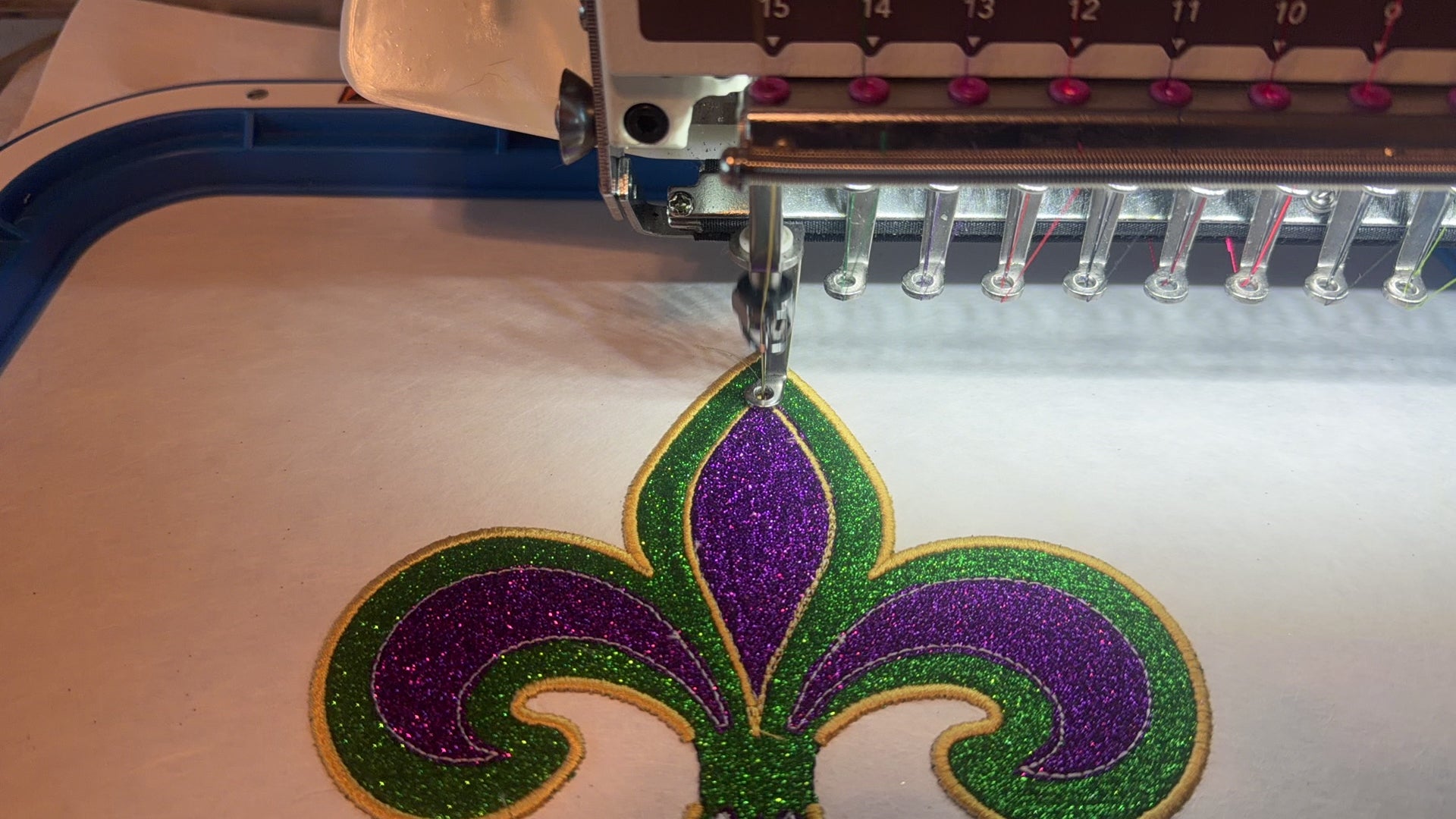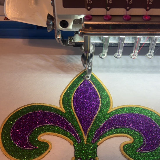- Design: Embroidered appliqué fleur de lis with glitter heat transfer vinyl accents